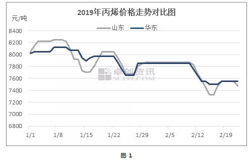 春節(jié)過(guò)后,丙烯市場(chǎng)整體走勢(shì)相對(duì)低迷,價(jià)格重心明顯下移。截至目前,2月份山東丙烯平均價(jià)格在7685.23元/噸,環(huán)比1月份跌幅在3.65%,同比跌幅在8.57%。2月份丙烯低迷行情符合市場(chǎng)預(yù)期,也驗(yàn)證了卓創(chuàng)在1月末的相關(guān)分析中的看空態(tài)度。究其原因,主要在供需層面。節(jié)前丙烯供應(yīng)恢復(fù)正常,前期檢修工廠陸續(xù)恢復(fù),丙烯供應(yīng)較為充足;而下游需求持續(xù)萎縮,尤其是聚丙烯粉料工廠出現(xiàn)降負(fù)荷甚至停工的情況,并且預(yù)期節(jié)后恢復(fù)時(shí)間將相對(duì)靠后。供需面的矛盾將對(duì)市場(chǎng)行情形成較大沖擊,直接導(dǎo)致價(jià)格重心回落,山東丙烯主流價(jià)格最低跌至7300元/噸,跌幅超預(yù)期。