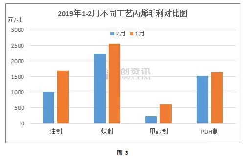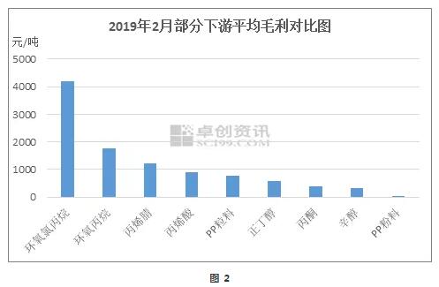 據(jù)卓創(chuàng)資訊監(jiān)測(cè),2月份丙烯各下游產(chǎn)品行情漲跌不一,但伴隨丙烯價(jià)格的走低,其主要下游產(chǎn)品盈利空間進(jìn)一步拓展。從上圖2可以看出,丙烯下游產(chǎn)品基本處于盈利狀態(tài)中,其中環(huán)氧氯丙烷、環(huán)氧丙烷及丙烯腈等產(chǎn)品平均毛利水平皆超過(guò)1000元/噸,而丙烯酸、PP粒料、正丁醇、丙酮及辛醇等產(chǎn)品平均毛利也在300-900元/噸之間。
